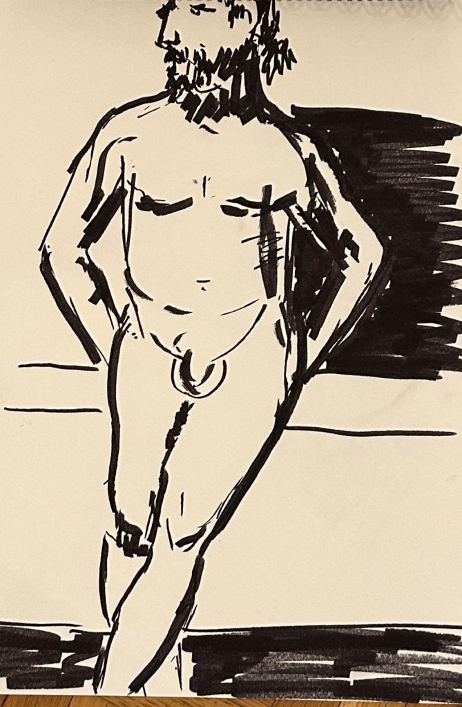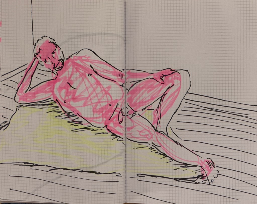 We spent a cosy and productive evening Life Drawing with Stephen as our model. Some of the better drawings are attached, more will be shown later in the gallery.